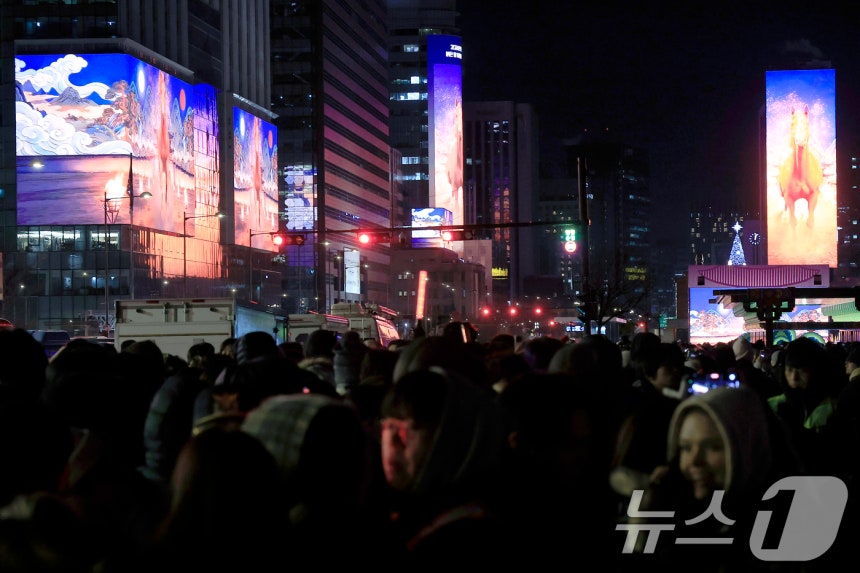(서울=뉴스1) 박정호 기자 = 다사다난했던 2025년의 마지막 날인 31일에서 2026년 '붉은 말의 해' 병오년(丙午年) 새해인 1일로 넘어가는 자정녁 서울시 광화문스퀘어 옥외광고물 자유표시구역에서 신년 카운트다운 쇼가 펼쳐지고 있다.