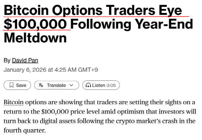 블룸버그는 “투자자들이 다시 디지털 자산으로 돌아올 것이라는 낙관론 속에서 트레이더들이 비트코인 가격의 10만 달러 복귀를 목표로 하고 있다”며 기사 제목을 ‘연말 폭락 이후 비트코인 옵션 트레이더들, 10만 달러를 노리다’로 꼽았다.